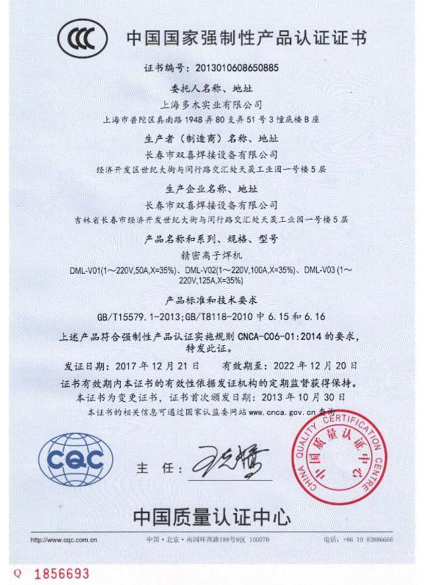 10月公司等離子焊機系列產品通過國家強制性產品認證(CCC) 獲得國家CCC認證證書